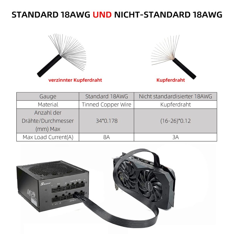 - Product features: Length (including plug): 60 cm, fineness: 1007-18AWG (standard copper wire with tin coating), (only suitable for graphics cards, not suitable for motherboards).