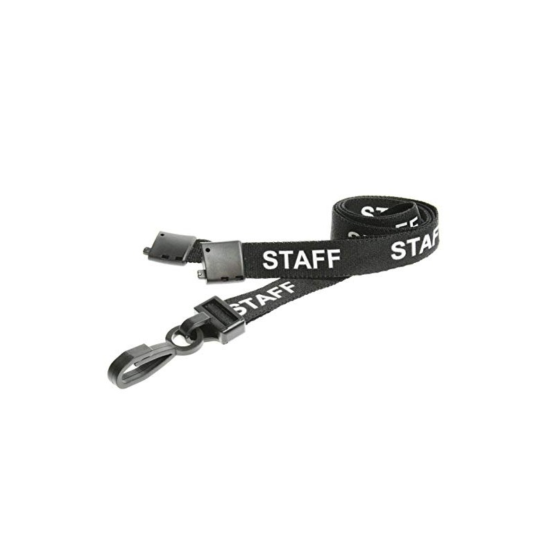 - Soft Nylon Material is used to make these Staff Lanyards, all come with plastic dog clips to hang your ID Card Holders from and hold your ID Cards, Each Staff Lanyard has Staff printed in white letters.