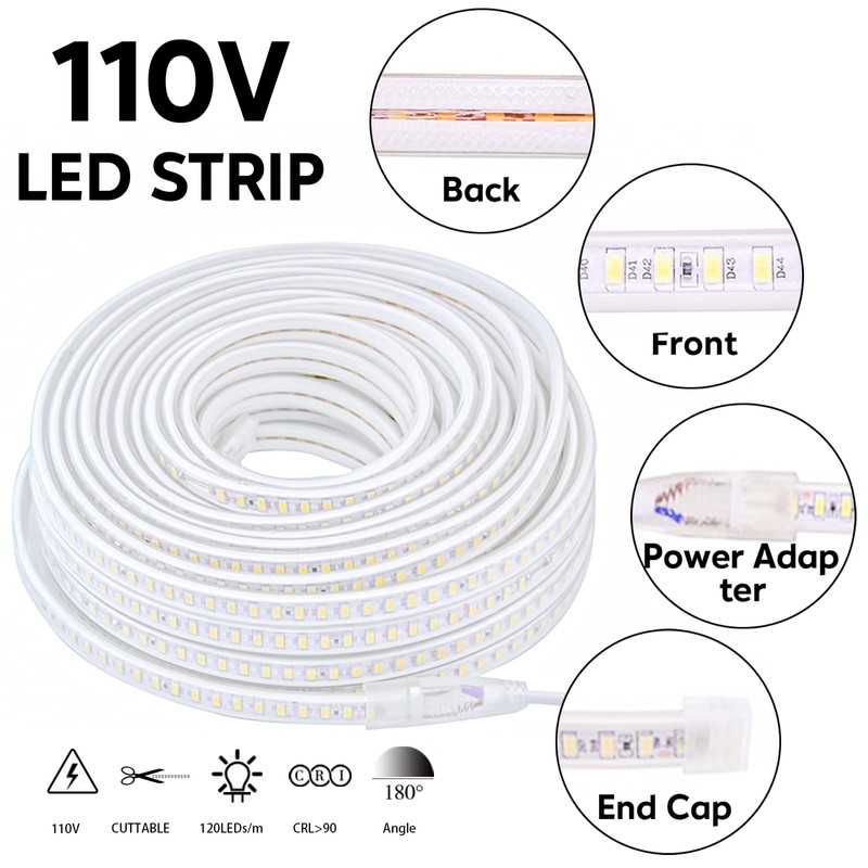 - 【Super Bright LED Light Strip】AC 110V 120 volt strip lights with 120LEDs/m high-brightness SMD 5730 rope light, 180° beam angle design for 50% wider lighting,multiple chips on board for uniform illumination,no more worries about dark spot. Super-bright lighting for any where.High intensity and definite reliability. Super-bright with low power consumption, running at low temperature