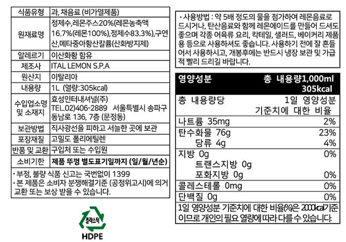 PD Lemon Juice 1000ml x 2 (38561632) / 피오디 레몬즙 1000ml X 2개 (38561632)