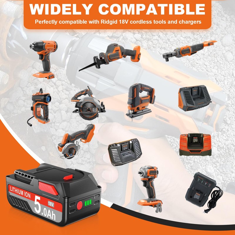 - PRODUCT SPECIFICATION: 100% Brand New| Replacement for Ridgid 18V Battery | Voltage: 18v | Capacity: 5.0AH/5000mAh | Battery Type: Lithium | Wattage: 90Wh|Rechargeable