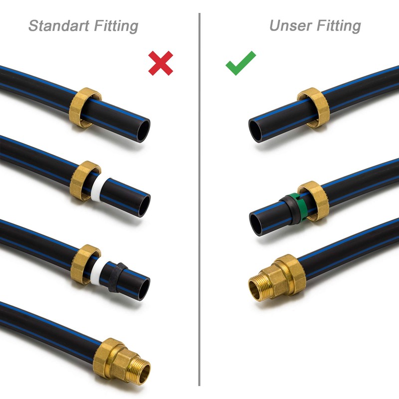 - All fittings come with a secure and easy to install sealing and anti-scraping system with a tapered dump seal (no O-ring).
