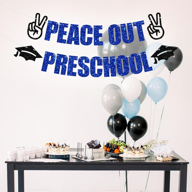 Peace Out Preschool Banner, 2025 Preschool Graduated Banner, Goodbye Preschool Hello Elementary School Decor, Kindergarten Grad Party Decorations Blue Glitter
