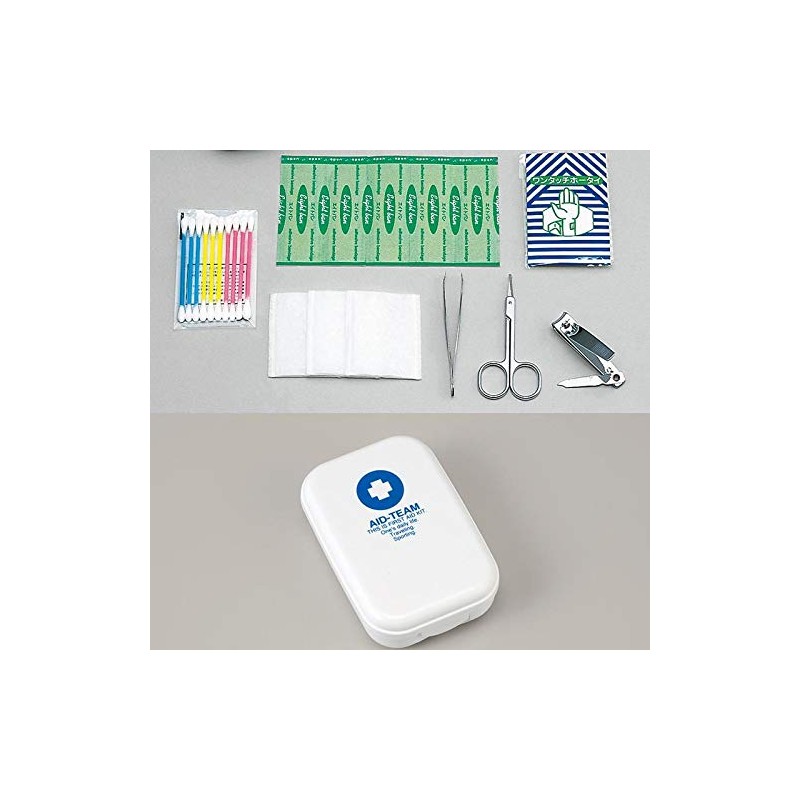 もしもの時に、あってよかった! コンパクトな応急処置救急セットです。 普段からカバンに入れておいても邪魔にならない、コンパクトサイズの専用ケースに納められています。 ケースはしっかりしたプラケースで、まだ少し余裕があるので、常備薬などをプラスしておくのもおすすめですよ。 爪切りやハサミなども入っていますので、旅行のお供にも使えます。 ■セット内容 ケース、ハサミ、つめきり、ピンセット、ワンタッチ包帯、 綿棒×10本、 コットン×3枚、エイドバン(絆創膏)×5枚 ■本体サイズ/重量 約115×76×30mm/約90g