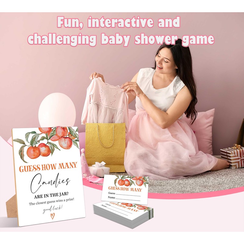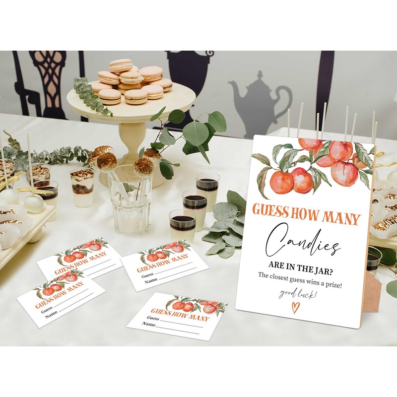Peach Guess How Many Candies Are In The Jar Game, Pack of 1 Wooden Tabletop Sign with Stand and 50 Guessing Cards, Sweet Peach Baby Shower Game, Gender Reveal Party Decorations - WV15