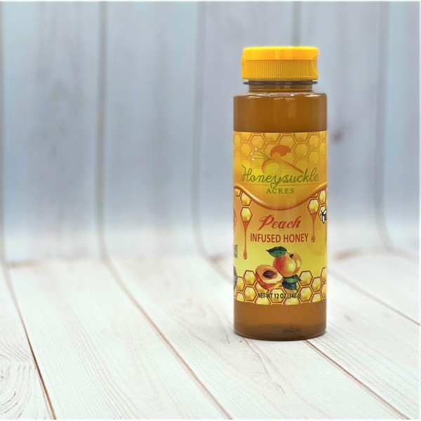 Nothing screams summer like the flavor of ripe peaches. Bring this to a family get-together and you'll see why this is one of our most popular flavors! Honeysuckle Acres flavored honey is superior not only because of the quality of honey, but also because we use certified organic flavor - giving it a taste that is truly gourmet! Our flavored honey contains NO artificial flavors or colors, NO added sugar or corn syrup. Use as a healthy alternative to jams, jellies, syrups & other spreads - that are full of processed sugar and corn syrup. Honey is naturally full of vitamins, minerals, amino acids, and antioxidants. It is also fat FREE & cholesterol FREE. Honeysuckle Acres...It's Honey. Reinvented.