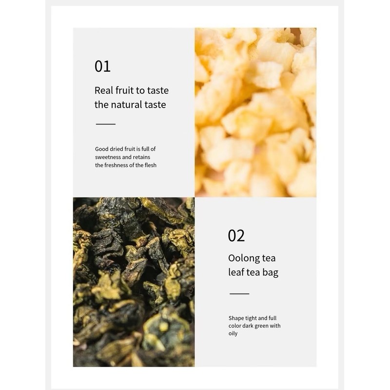 - Ingredients: Oolong tea, dried apples, dried peaches, food flavor