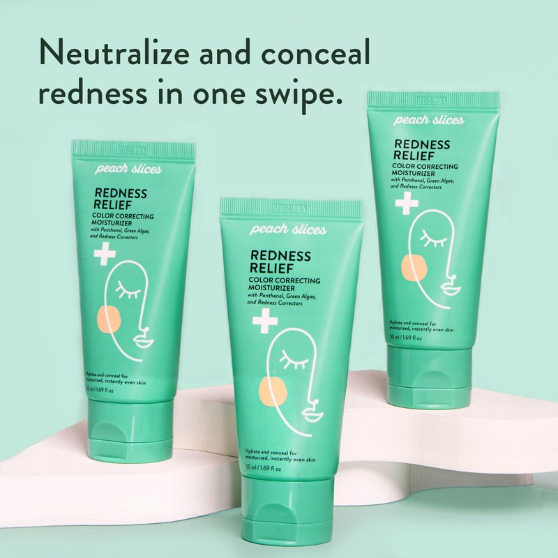- Peach Slices Redness Relief Color Correcting Moisturizer instantly conceals and corrects redness while deeply moisturizing and calming skin. Clean Color Correcting Technology intelligently adjusts color to leave red, irritated skin looking even, and smooth.