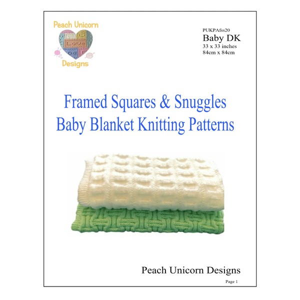 Peach Unicorn Designs Knitting Patterns for Baby Blankets x 2, Framed Squares and Snuggles, Double Knit DK Yarn, Beginner Knit & Purl Patterns,A5 Booklet