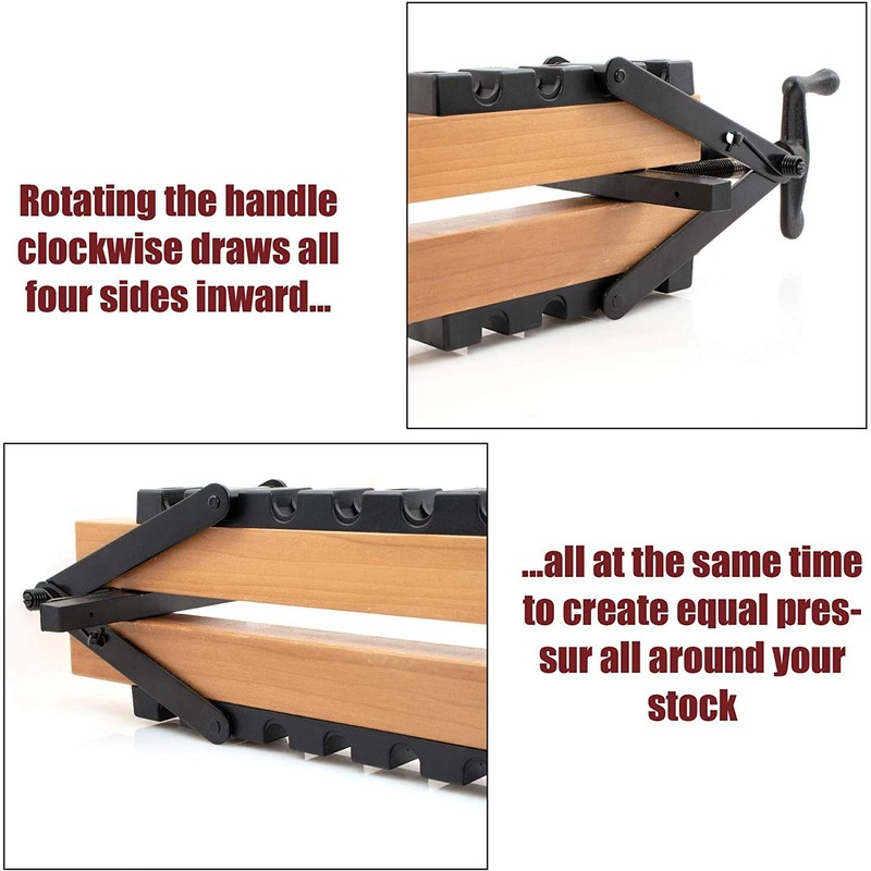 - Build Any Length Clamp With The Durable Plastic Bars With 4 Notches For Maximum Adjustability To Handle A Variety Of Stock Widths. Clamp Can Be Used For Boards Up To 6 Inches In Thickness By Simply Adjusting The Clamp Width Capacity With The Appropriate Number Of Notches. Turn The Handle Clockwise To Tighten The Clamp And Turn The Handle Counter Clockwise To Release Pressure. The 4 Way Pressure Clamp Is Equipped With Side Pressure Pads To Prevent Damaging Your Stock