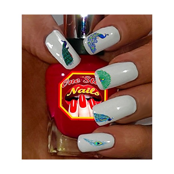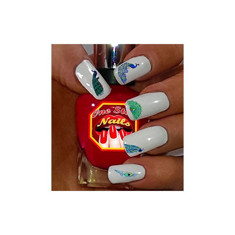Peacock and peacock feathers clear waterslide nail art decals. Set of 61.