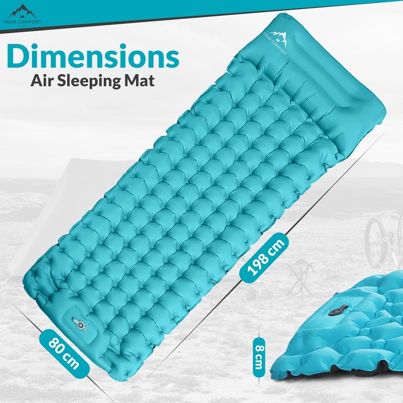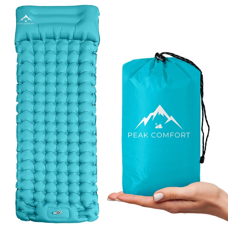 PEAK COMFORT Self-Inflating Sleeping Mat for Camping - Thick Waterproof Mat in Aqua Marine Blue for Outdoor Hiking, Backpacking, Camping - Built-In Foot Pump & Pillow, Carrier Bag Included.
