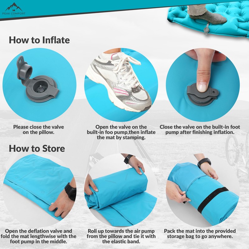 - EFFORTLESS SETUP: Our camping mat inflates effortlessly with a built-in foot pump, allowing for quick inflation and deflation, so you can spend less time setting up camp and more time enjoying the outdoors.