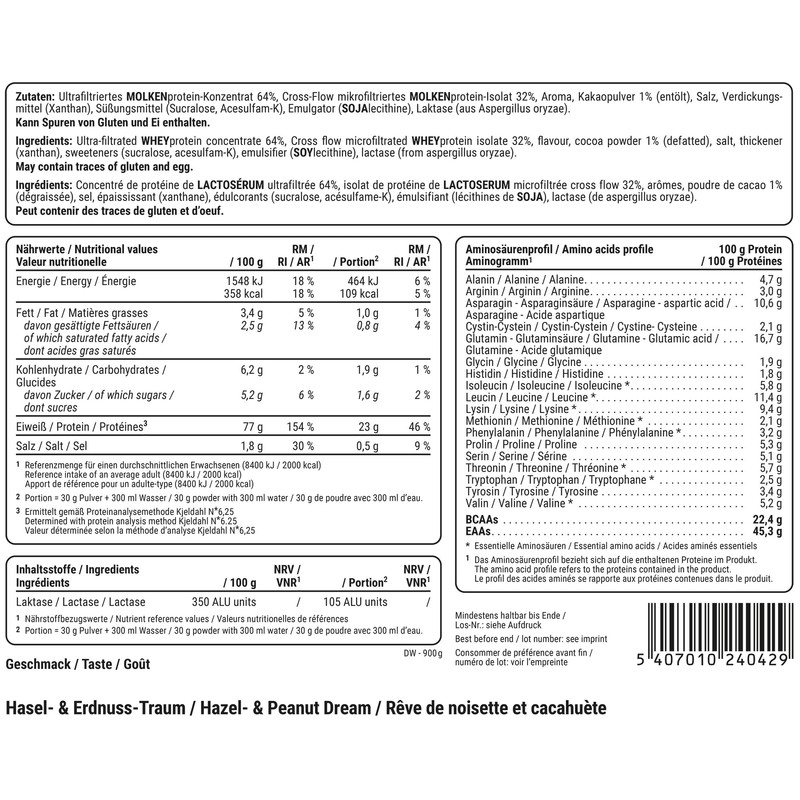 Thanks to perfect solubility, you get an extremely delicious milkshake replacement in seconds with Delicious Whey Protein. Instead of tons of sugar and fat, this shake provides you with a rich 78% protein* made from high-quality whey protein. Thanks to this high protein content, Delicious Whey Protein has been proven to support the building and maintenance of muscle mass. The whey protein component consists of 32%* cross-flow filtered whey protein isolate and 64%* ultra-filtered whey protein concentrate.