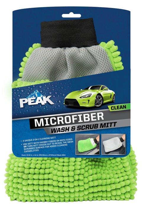 The Peak Wash & Scrub Mitt is a unique, reversible 2-in-1 wash mitt. Use the mitt wet with plenty of car soap and water to gently clean your vehicle. The mitt can be used with knobby fibers on both sides OR turn inside-out to reveal the mesh scrubber surface which helps to remove stubborn dirt and grime.