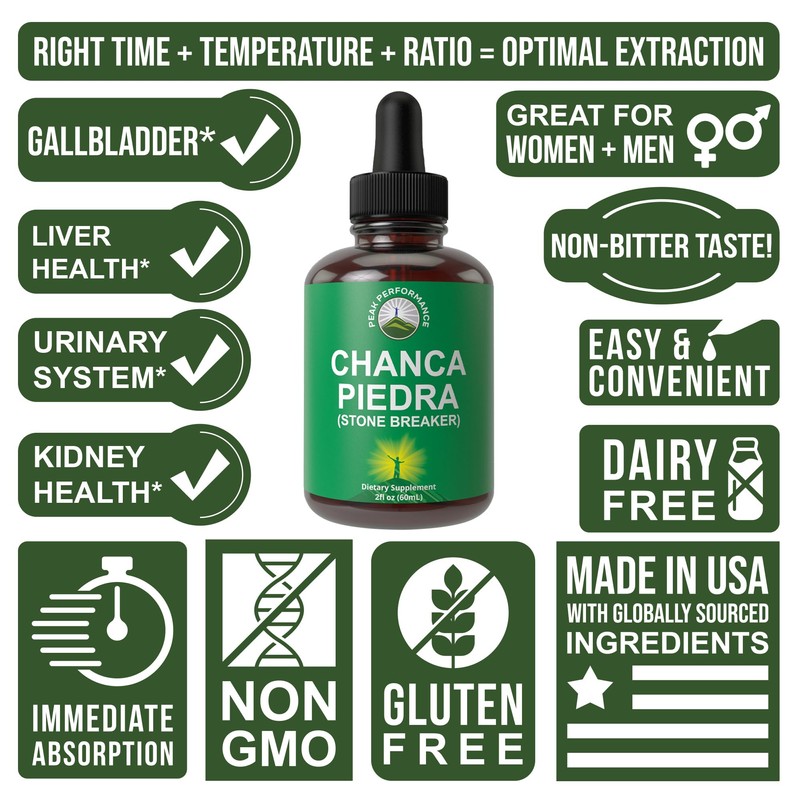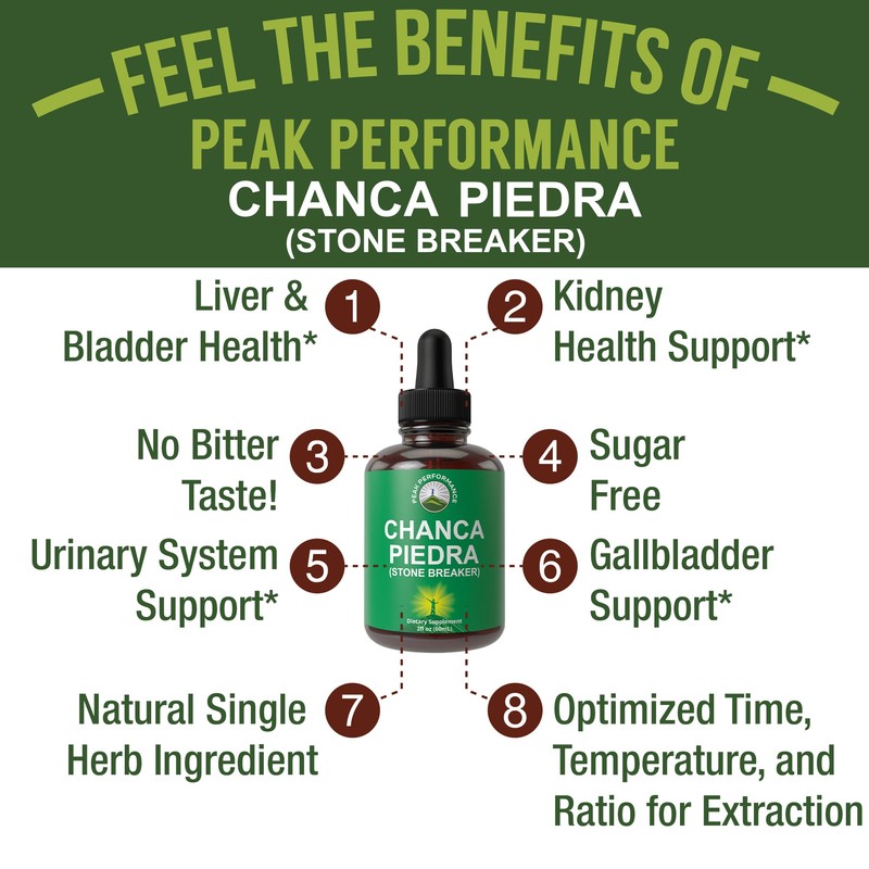 - Single Herb Ingredient - Chanca Piedra has been used traditionally to aid with gallbladder, liver, kidney and urinary health. At Peak Performance, our Chanca Piedra Extract is natural, gluten free, sugar free, without the bitter taste. Simply mix these drops in any drink and you won't even taste it!