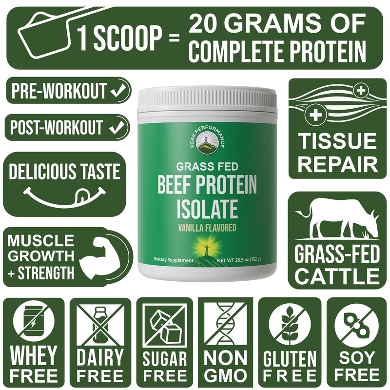 - 1 Scoop = 20 grams of Complete Protein! - Peak Performance Grass Fed Beef Protein Isolate is a superior alternative to protein sources containing common allergens such as dairy, soy, and whey. This product provides a complete source of protein, offering essential nutrients derived from real beef.