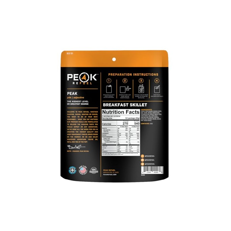 - 100% REAL MEAT & DOUBLE PROTEIN - At Peak Refuel, we use only 100% USDA-inspected meat, never TVP or fillers. Our meals provide nearly twice the protein per serving compared to most outdoor meals. Our 2-Pack Breakfast Skillet contains a total of 62 grams of protein and 1080 Total Calories to be exact, giving you the energy needed for rigorous activities.