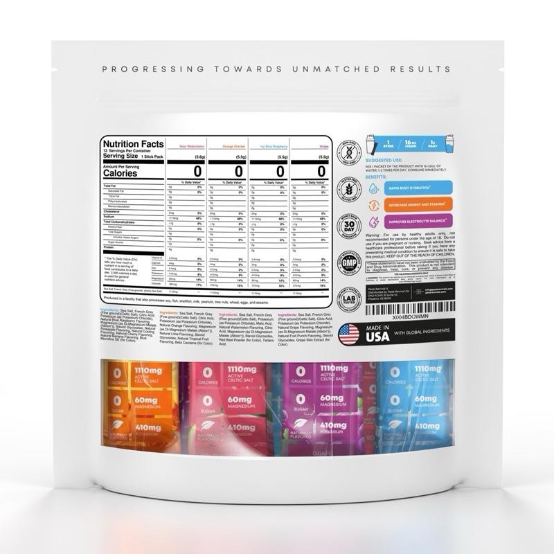 Peak Revival-X Peak Salt Electrolyte Hydration Beverage Variety Pack – 12 Sticks is a premium hydration solution designed to replenish electrolytes, boost energy, and support stamina. Each stick is packed with magnesium, potassium, and natural Celtic salt to help maintain balance during workouts, sports, or any active lifestyle.