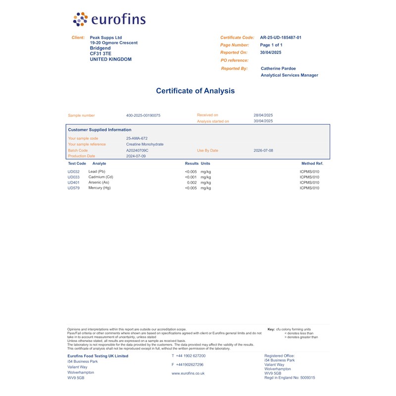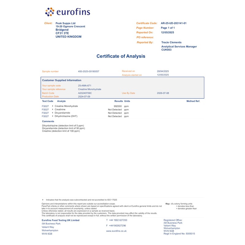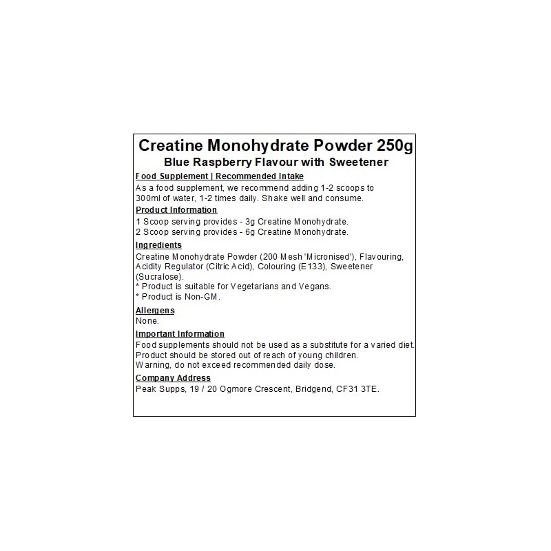 Product descriptionWhat is Creatine Monohydrate?Creatine Monohydrate is one of the most commonly used and extremely researched sports supplements in the world. Creatine increases physical performance in successive bursts of short-term, high intensity exercise. Creatine also helps to improve power and strength performance.Although Creatine is found in several meat sources it can be difficult to obtain the desired levels, which is why we offer creatine powder and tablets. Peak Supps Creatine Monohydrate Powder offers a fast, effortless way to obtain all the benefits of Creatine without the fuss. This makes it ideal for anyone involved in intense exercise and looking to enhance their performance.Peak Supps Creatine Monohydrate is micronized 200 mesh particle size which ensures easy mix ability and fast absorption. Our creatine powder is also available in three delicious flavours: Apple, Blue Raspberry & Fruit Punch.Benefits of Creatine Powder: Delicious tasting flavours - Apple, Blue Raspberry & Fruit Punch. Support muscle mass, strength, power and endurance. Extensively studied over decades - Supports ATP and energy levels. Popular pre workout for a wide range of athletes. Suitable for vegans and vegetarians.Who is Creatine Monohydrate Powder suitable for?Peak Supps Creatine Monohydrate Powder is suitable for those looking for a high-quality Creatine supplement. They are suitable for the general public and athletes.If you're currently taking medication, we would recommend checking with a doctor or medical professional before taking this supplement.IngredientsIngredientsBlue Raspberry - Creatine Monohydrate Powder (200 Mesh 'Micronised'), Flavouring, Acidity Regulator (Citric Acid), Colouring (E133), Sweetener (Sucralose).DirectionsRecommended IntakeAs a food supplement, we recommend adding 1-2 scoops (3-6g) to 300ml water, 1-2 times daily. Shake well and consume. After 8 weeks of continued use take 1 week off and start period again.Safety WarningFood supplements are not intended to replace a varied and balanced diet. Do not exceed the recommended usage. Keep out of reach of children.Manufacturer Contact InformationPeak Supps, 19/20 Ogmore Crescent, Bridgend Ind Estate, Bridgend, CF31 3TE.