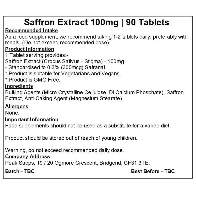 Product descriptionWhat is Saffron?Known as the most expensive spice in the world, Saffron is used in cooking recipes to add a sweet and floral taste to dishes. The spice is hand picked from the flower Corcus Sativus where the stigmas are ground up and used.Saffron contains antioxidants such as safranal, crocetin & crocin. Antioxidants can help fight free radicals and play a role in protecting DNA, proteins and lipids from oxidative stress. These antioxidants are also known as carotenoids which give different foods their orange colour, these include carrots, salmon and daffodils.Saffron has recently gained popularity as a dietary supplement and is commonly found in tablet or capsule forms. Our tablets provide 300mcg of safranal which gives Saffron its unique aroma and taste.Benefits of Saffron: Each tablet provides 300mcg of safranal. High in antioxidants. Hand picked from the flower Corcus Sativus. Known as the most expensive spice in the world. Suitable for vegans and vegetarians.Who is Saffron suitable for?Peak Supps Saffron Tablets are suitable for those looking for a high-quality Saffron supplement. They are suitable for the general public and athletes.If you're currently taking medication, we would recommend checking with a doctor or medical professional before taking this supplement.IndicationsProduct InformationEach tablet provides:Saffron Extract (Crocus sativus - Stigma) - 100mg- standardised to 0.3% (300mcg) SafranalIngredientsIngredientsBulking Agents (Micro Crystalline Cellulose, Di Calcium Phosphate), Saffron Extract, Anti Caking Agent (Magnesium Stearate).DirectionsRecommended IntakeAs a food supplement, we recommend taking 1-2 tablets daily, preferably with meals.*Do not exceed the recommended dose.*Suitable for Vegetarians and Vegans.*Product is GMO Free.Safety WarningFood supplements are not intended to replace a varied and balanced diet. Do not exceed the recommended usage. Keep out of reach of children.Manufacturer Contact InformationPeak Supps, 19/20 Ogmore Crescent, Bridgend Ind Estate, Bridgend, CF31 3TE