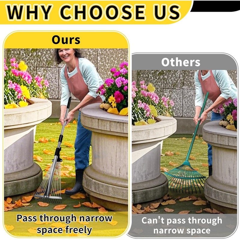- NARROW HEAD FOR PRECISION CLEANING: The slim 8.5 narrow rake head glides into tight corners, garden beds, and between patio stones. A must-have small leaf rake for meticulous leaf rakes for lawns maintenance, paired with a collapsible design for compact storage in sheds or car trunks.