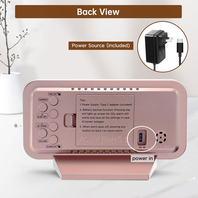 - Electric Alarm Clock with Battery Backup: With a safe type C adapter (cord length 60 inches) as a power supply, this digital LED clock is able to run smoothly and accurately, an absolute must for anyone who values punctuality and reliability. 4 AAA batteries (not provided) help memorize settings and trigger the alarm in the event of power outage. This way you won't oversleep and never need to reset clock.