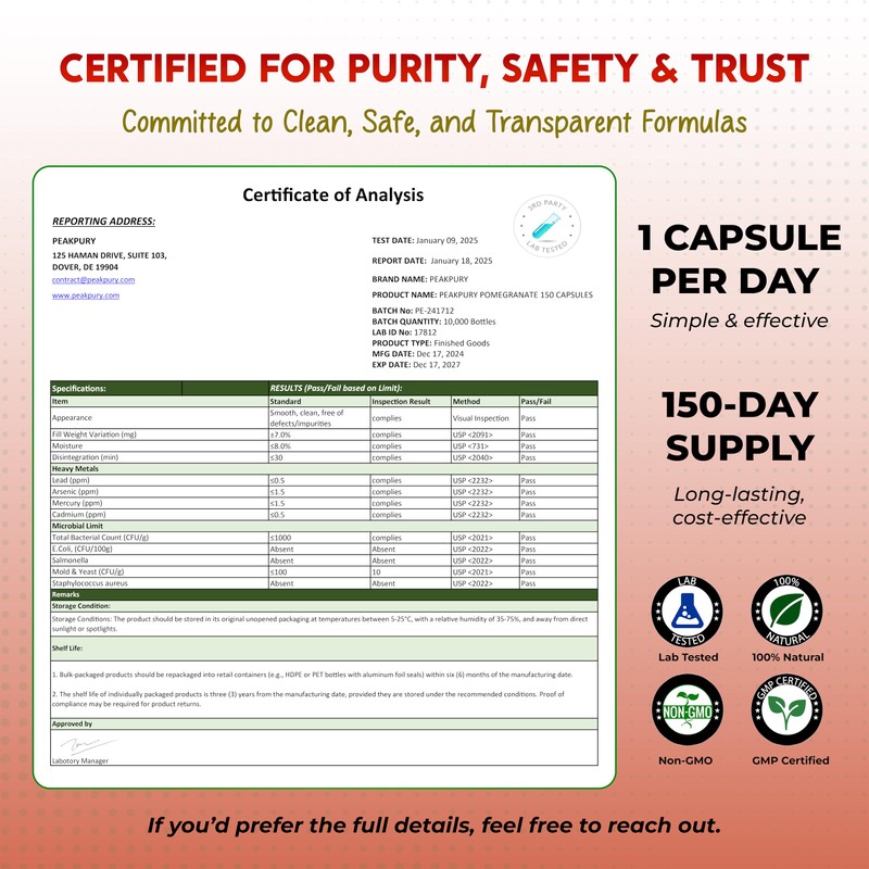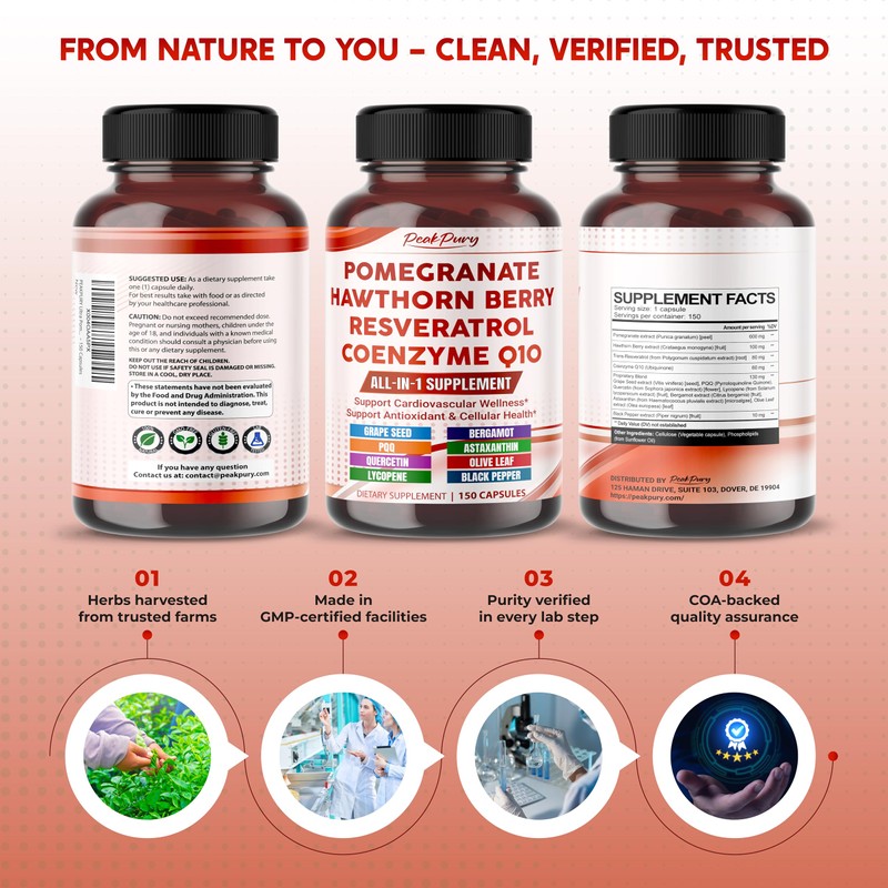 You've tried multiple supplements to support your heart and cellular health but nothing truly seems to work. Maybe what you need is a more complete and effective solution that supports your body from within.PeakPury Pomegranate brings together 12 ingredients, including Pomegranate, Hawthorn Berry, Resveratrol and more, to help support heart wellness, healthy circulation and energy production at the cellular level. You may start to feel more energized, more resilient, and better able to handle daily demands inside and out.Just one capsule a day gives you a powerful yet simple routine with a 5-month supply, no complicated schedules. Made in GMP-certified facilities with clean, purposeful ingredients and no unnecessary fillers, PeakPury is your trusted daily companion for clarity, calm, and long-term support.