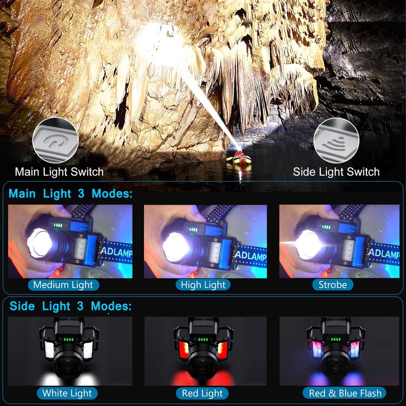 - 【White and Red LED & 3+3 Modes】: This LED head torch super bright has 2 lighting sources, the main light provides 3 lighting modes: medium/ high/ strobe. The secondary light provides 3 colour light modes: white/ red/ red blue flash. Red blue light is suitable for outdoor emergencies or bad weather. Dual switch: main light and sub light switch independently. Main light and sub light can be turned on at the same time.