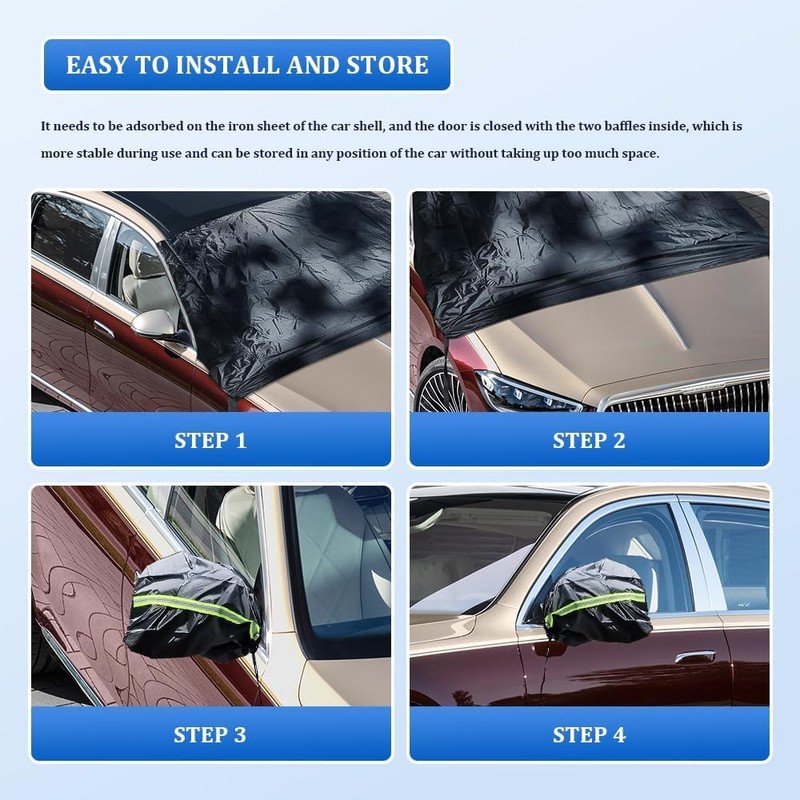 - [Easy to Install]:Simply unfold the windshield frost protector cover, attach the magnet to the iron of the car shell, use the remaining two sides of the flaps to clip it in the door and close it, then hook the hooks to the wheel hubs