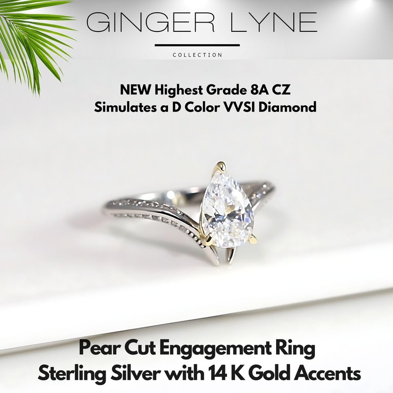 Pear CZ Engagement Rings for Women by Ginger Lyne |1.5 Ct Faux Diamond Ring | 925 Sterling Silver 14K Gold Wedding for Women | Travel Promise or Bridal for Her | Size 6