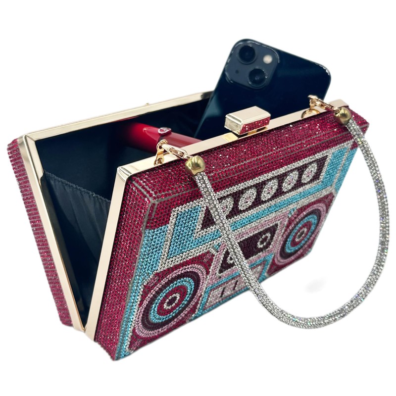 pearl&she Diamond Women Evening Handbags Purse Minaudiere Clutch Bag,Stack of Cash Dollars Crystal Clutch Purses, Red Radio, Small