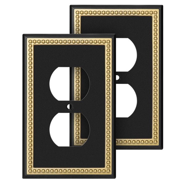 Pearled Frame Decorative Wall Plate Switch Plate Outlet Cover (Single Duplex 2PK, Black & Dark Golden)
