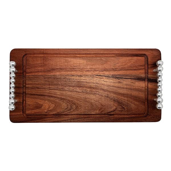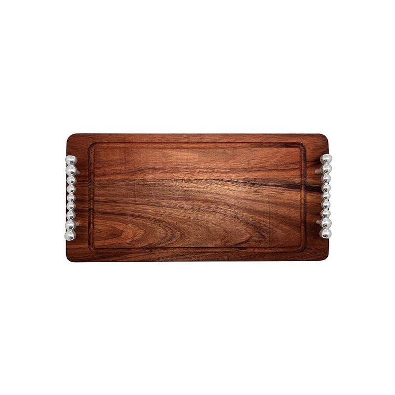 - Secure your hosting needs with our Pearled Handled Dark Wood Tray. The handles are handcrafted from 100% recycled aluminum and placed on a sustainably harvested Caribbean Walnut tray. Get your crew together and serve on a statement piece.Dimensions: 19" L x 9" W x 2.36"H