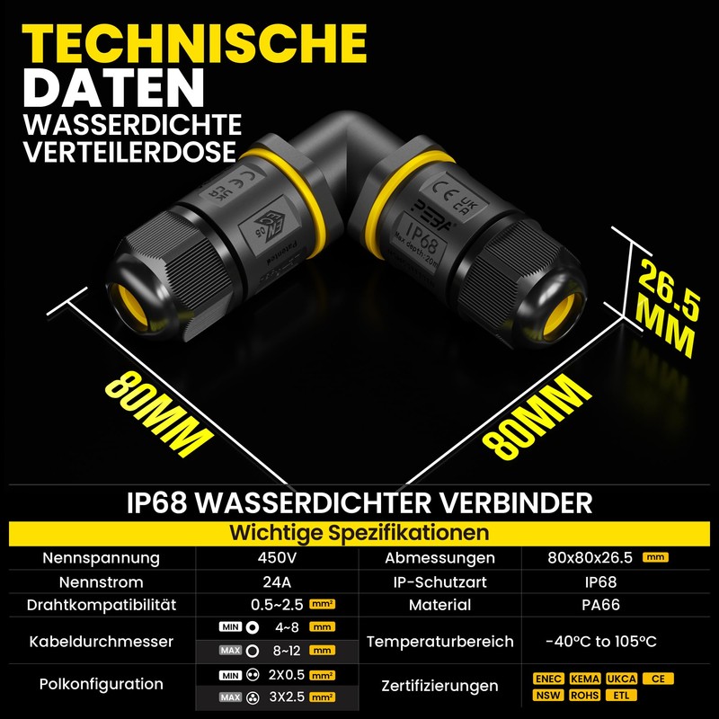 PEBA Cable Connector Waterproof Junction Box IP68 Junction Box Clamp Box for Outdoor Use L-Shape 3-Pin for Diameter 4 mm - 12 mm Cable Diameter for Garden Outdoor Waterproof Black Pack of 2