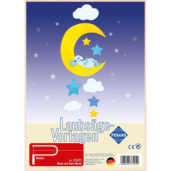 Pebaro 374/2S Fretsaw Template Mobile Wind Chime Mouse on the Moon, 3 mm Plywood, DIN A4, Pre-Printed Motif, Saw with Fretsaw Bow, Craft, Paint, Ready, Craft with Wood, Gift Idea