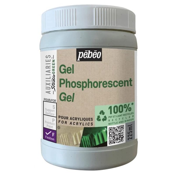 - Pébéo Studio Green phosphorescent gel: Volume: 225 ml, phosphorescent gel that reproduces light in the dark. Optimal performance alone and thick applied. Finish: translucent and satin finish