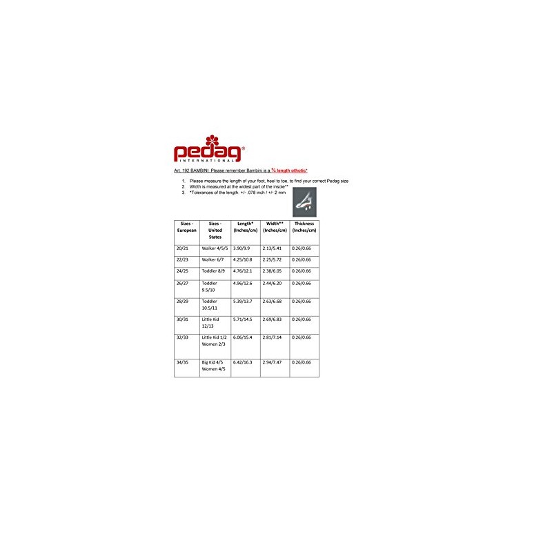 BAMBINI: Made of prime quality, vegetable tanned leather, Bambini is the children's orthotic developed by orthopedic experts. Foot supports have proved to be extremely useful when it comes to the development of children's feet. Bambini's longitudinal arch support keeps the foot in the correct, naturally balanced position. Bambini actively protects the ankle joint. Bambini counteracts deflection and deformation of the longitudinal arch which helps prevent the development of �splayfoot". Bambini is particularly resilient and flexible, allowing the free play of the foot's muscles thus strengthening them. Bambini has been awarded the American Podiatric Medical Association (APMA) Seal of Acceptance. Tan leather. Pedag merges 3 elements: Nature, Science and Technology to produce products that are good for the modern foot. Nature is found in Pedag's use of high quality natural materials such as vegetable tanned leather, pure cotton, wool, sisal, water based adhesives and active carbon. Science is found in Pedag's use of supportive, anatomically correct footbeds and inserts that support the arches, muscles and ligaments of the foot. Supporting the foot adequately provides a base from which to support the ankles, hips and spine. Pedag orthotics stress Support rather than simple Cushioning. Pedag insoles (orthotic or plain) allow the foot to breathe inside the shoe, keeping feet and shoes fresh. Did you know the foot produces a shot glass of perspiration daily. Insoles that absorb moisture, breathe and prevent odor are necessary for healthy feet. Technology is found in Pedag's modern manufacturing facilities in Germany (even though much of the production of our insoles is still done by hand), stringent quality controls and introduction of cutting edge technologies such as innovative new material to insulate against cold.