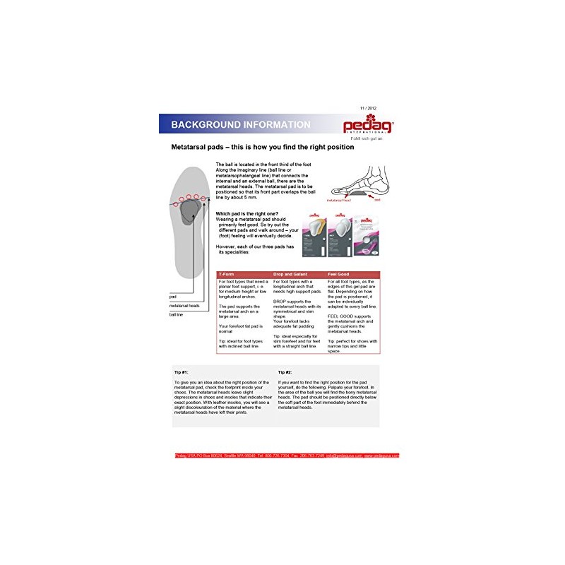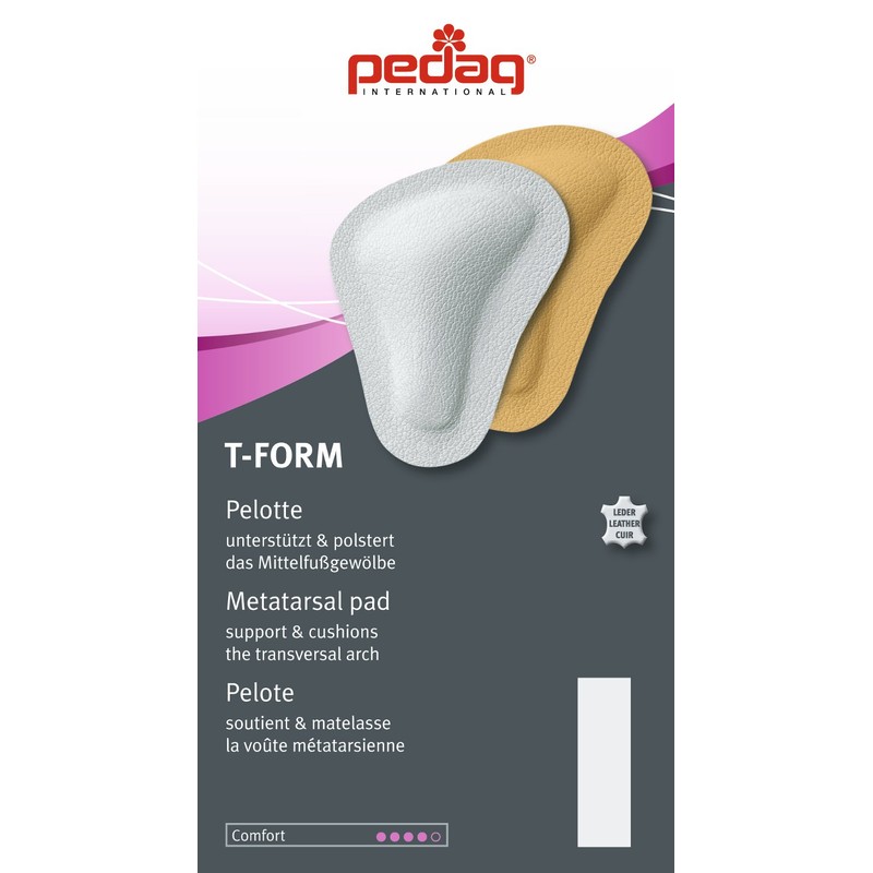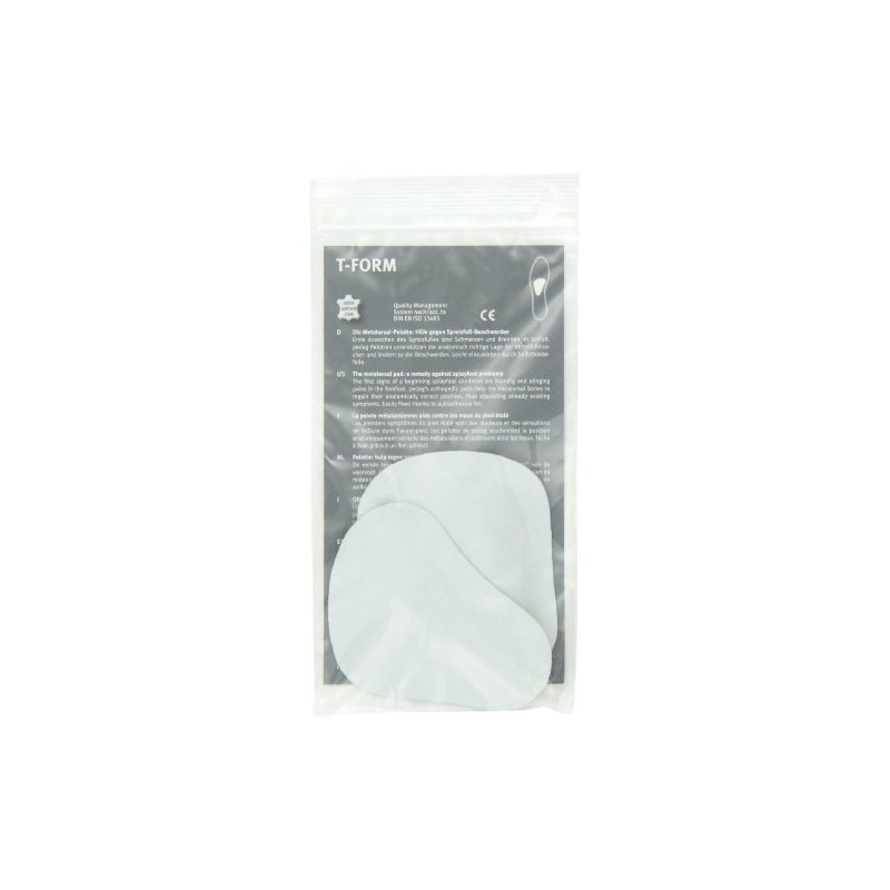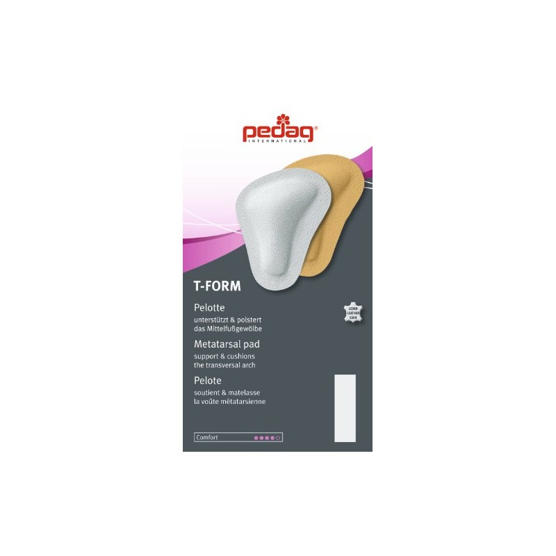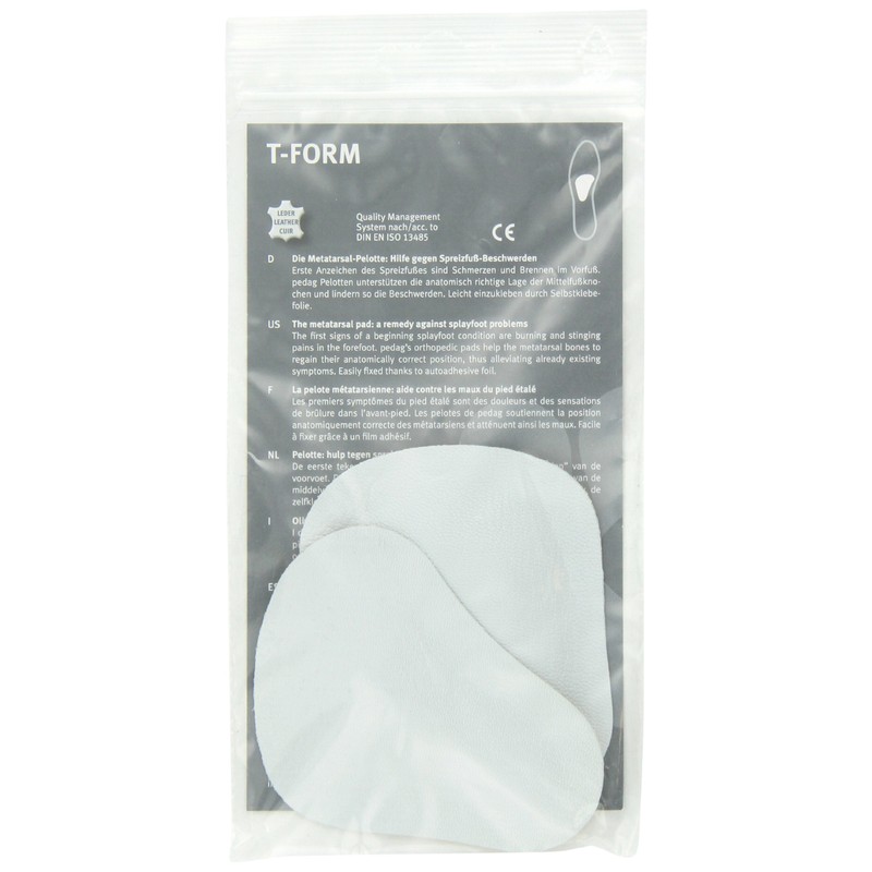 T-form metatarsal pads: t shaped metatarsal pads. Needs of the metatarsal area are often neglected. However, once problems develop, the pain and disability they cause can be as severe as those in the mid-foot or heel. T form is an orthopedic insert that assists the metatarsal arch to retain, or regain, its natural anatomical shape. Lifting the forefoot back into shape relieves pressure and the stinging, burning sensation that you may be experiencing. These symptoms indicate that the stress on your forefeet is leading to nerve damage and the collapse and spreading of the forefoot area. For active people, such as bicyclists, dancers, runners, tennis player, and others who use their forefoot and toes, t-form helps to prevent overuse injuries, and long-term problems from developing. Pedag makes several metatarsal inserts. Those with active pain and inflammation may want to use pedag drop, feel good, or galant until the inflammation subsides. These are also good choices for those without flexibility, or adequate fat pads, in their forefeet since they are substantially smaller then t-form. For information on which metatarsal pad is right for you, and where to place the pads, please look at some guidelines in one of the pictures above. T-form is made of vegetable tanned leather and hypoallergenic latex, with a self-adhesive backing. You know you like t-form, so save a little with this pack of 3 pair.