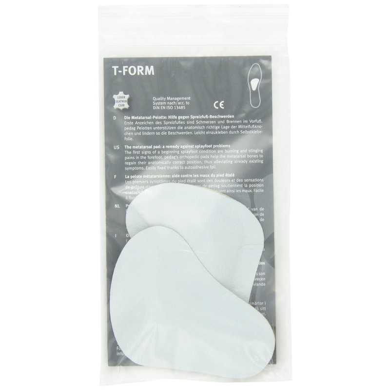 T-form metatarsal pads: t shaped metatarsal pads. Needs of the metatarsal area are often neglected. However, once problems develop, the pain and disability they cause can be as severe as those in the mid-foot or heel. T form is an orthopedic insert that assists the metatarsal arch to retain, or regain, its natural anatomical shape. Lifting the forefoot back into shape relieves pressure and the stinging, burning sensation that you may be experiencing. These symptoms indicate that the stress on your forefeet is leading to nerve damage and the collapse and spreading of the forefoot area. For active people, such as bicyclists, dancers, runners, tennis player, and others who use their forefoot and toes, t-form helps to prevent overuse injuries, and long-term problems from developing. Pedag makes several metatarsal inserts. Those with active pain and inflammation may want to use pedag drop, feel good, or galant until the inflammation subsides. These are also good choices for those without flexibility, or adequate fat pads, in their forefeet since they are substantially smaller then t-form. For information on which metatarsal pad is right for you, and where to place the pads, please look at some guidelines in one of the pictures above. T-form is made of vegetable tanned leather and hypoallergenic latex, with a self-adhesive backing. You know you like t-form, so save a little with this pack of 3 pair.