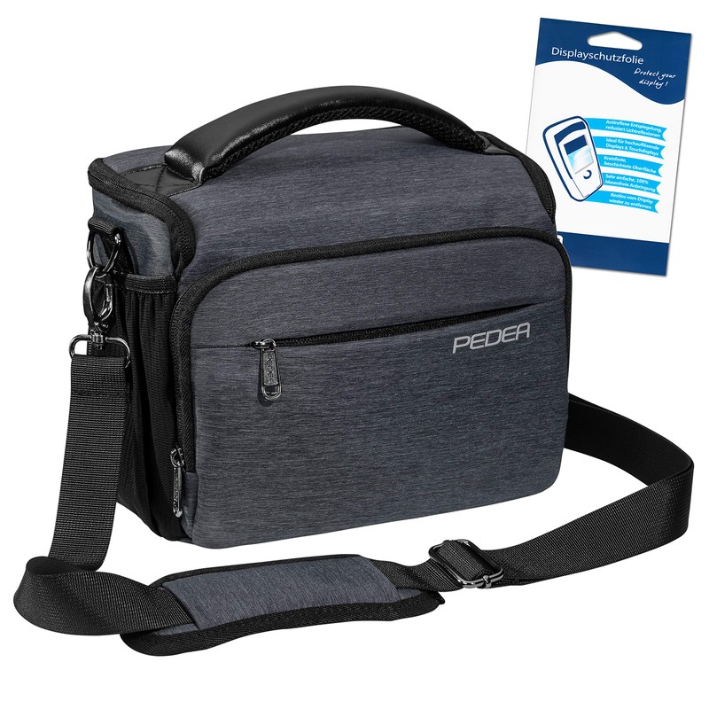 PEDEA DSLR-Kameratasche "Noble" mit Displayschutzfolie für Olympus E-M5 Mark II Pen E-PL8 E-PL9 / Canon EOS M50 / Nikon D5600 D7500 / Panasonic G9 G70 G81 GX8 / Fujifilm X-T3 X-T100, Gr. XL grau