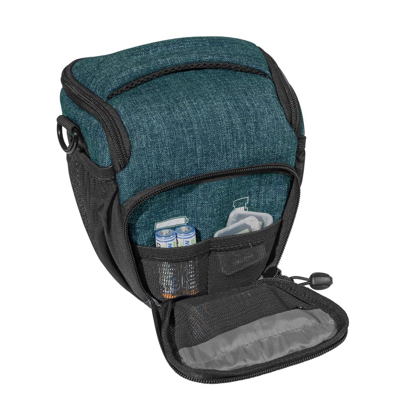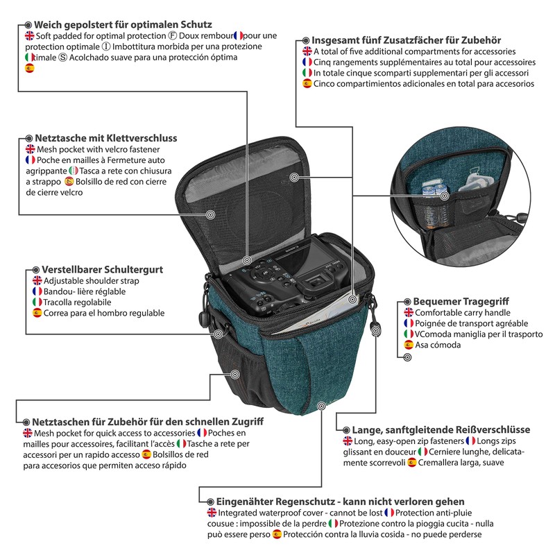 - Practical division in the camera bag thanks to various compartments: 1 x main compartment, 5 x additional compartments for accessories and a belt holder