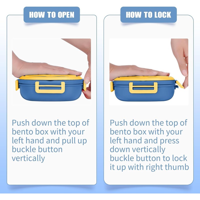 Product Features: 1.A Kiddie Delight: Our vibrant Cool Blue Bento Box is designed to catch your little one's eye! With a four-sided lock system and food-grade leak-proof rubber ring, it ensures freshness and no messes. Plus, the portable handle makes it a breeze to carry. Lunchbox dimensions: 6.81 x 6.81 x 2.51 inches. Suitable for ages 1 to 3.