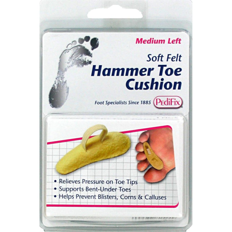 Hammer Toe Cushion eases pressure on toe tips as it comforts and supports bent-under toes. This soft, contoured pad also relieves forefoot pain while helping prevent blisters and corns. Adjustable toe loop holds cushion securely in place. Soft, durable top cover.