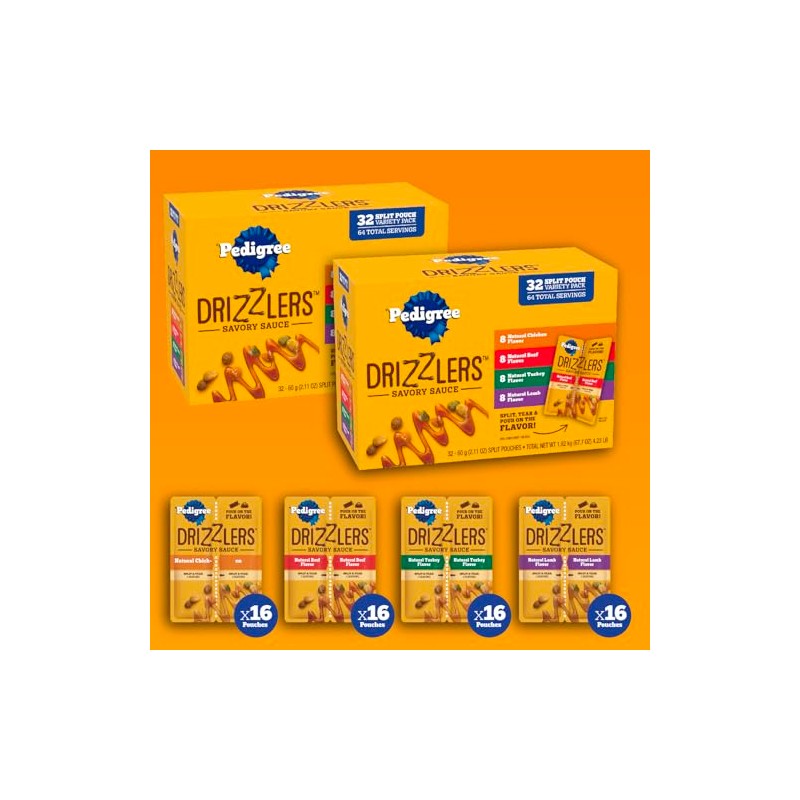 Pedigree Pedigree Drizzlers Wet Dog Food Savory Sauce Multipack, 60g Dual-Serving Pouches, 32 Count, Pack of 2 (64 Pouches, 128 Servings Total)
