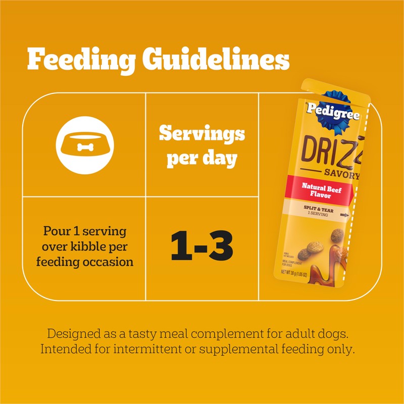 - Pour on the Flavor: Coat Pedigree Drizzlers Wet Dog Food Savory Sauce over your dog's dry dog food and watch the flavor fill the bowl while maintaining the kibble's crunchiness