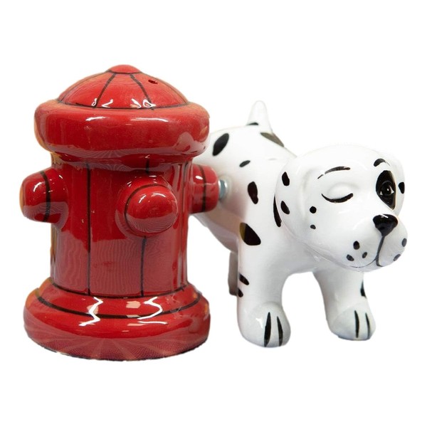- This Dalmatian Peeing On Fire Hydrant salt pepper shaker set is made of high quality glossy ceramic, hand painted and polished.