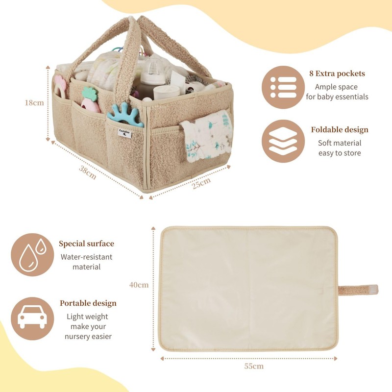 - Organiser: Keep everything in one place with our Portable Nappy Caddy & Changing Mat Set. Customise to suit your needs, includes an additional 8 side pockets providing extra storage space. Keep all your essentials neat & accessible