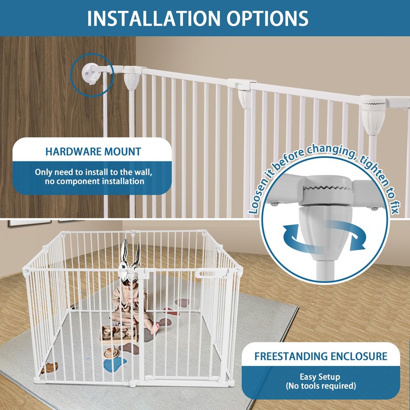 - Easy Installation and Multiple Function - convert from wide opening gate to 8-panel play place