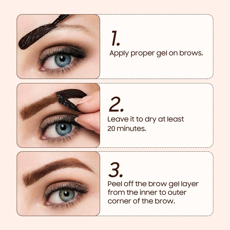- 【EASY TO USE】Using the eyebrow brush, apply a layer of brow gel onto the eyebrows, ensuring even coverage. Wait patiently for 20 minutes, then peel off to reveal full and refined eyebrows. And then you can save time and enjoy 3 days with defined eyebrows. Attention: If you want to have long-lasting eyebrows, Moreover, our eyebrow gel can be easily removed with makeup remover.